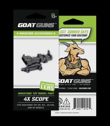View full detailsMINIATURE 4X SCOPE ZOOM SCOPE FOR GOATGUN TOY MODELS Fits AR-15 and Bullpup models Available in Black or Coyote! Does not fit on the Sniper o...